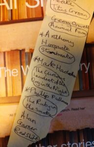 I like finding things in second-hand books. Old bookmarks and postcards. I recently came across a bookmark-width reading list inside Ali Smith’s short story anthology The Whole Story and Other Stories. See image below. The reader details the books they have either read or want to read. Some are asterisked for an unknown reason.