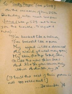 Meanwhile, in a much older book, Jane is wishing Lusty Roger a happy birthday. The inscription from 1974 is in a second-hand copy of The Common Muse. Click the image below to read.