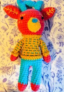 I had seen an episode of Kirstie’s Handmade Christmas and inexplicably fell in love with a crocheted reindeer. I went to a wool shop the following day, bought a hook and some yarn, watched a YouTube video, and within minutes had a neat, red, crocheted swatch. I eventually located a downloadable pattern by the woman who won that episode of Handmade Christmas and made my own little reindeer. It was May by then, but reindeers are not just for Christmas.